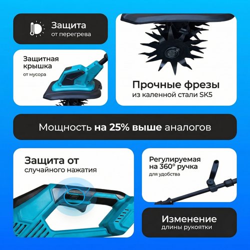 Этот компактный и лёгкий агрегат с 4 острыми лезвиями легко справится с рыхлением почвы, удалением сорняков и подготовкой грядок к посадке. Мощный двигатель обеспечит быструю и эффективную работу, а съёмный аккумулятор позволит вам работать без привязки к розетке.
